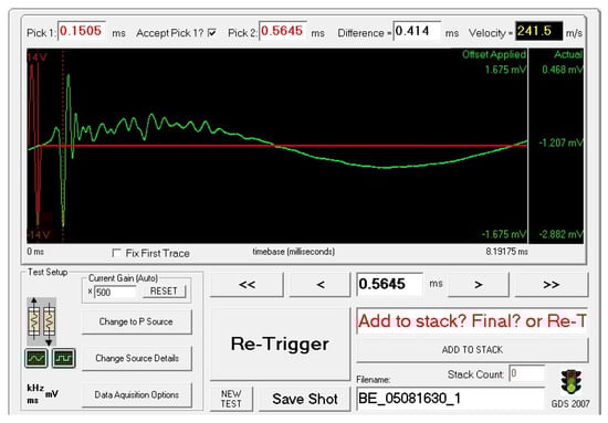 The phase of the transmitting curve should be the same as that of the receiving curve. As shown in Figure 4, the red curve was the emission curve, and the green curve was the reception curve. Transmission time and the shear wave velocity were automatically calculated by the computer.