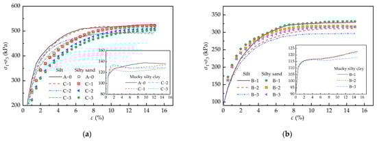 The deviator stress–strain curves of silt, silty sand, and mucky silty clay under various stress paths are shown in Figure 5, and the deviator stress at 15% axial strain is summarized in Table 4. Silt and silty sand have comparable shear strength, but mucky silty clay has much lower shear strength due to its high clay particle content. The deviator stress for Group B was less than the deviator stress for Groups A and C. This was mainly because the confining pressure of Group B (60 kPa) was smaller than the confining pressure of Groups A and C (150 kPa). The difference in deviator stress between Groups B and A was much smaller for mucky silty clay, indicating that the influence of confining pressure on the shear properties of mucky silty clay is not readily apparent due to its high void ratio and clay particle content.