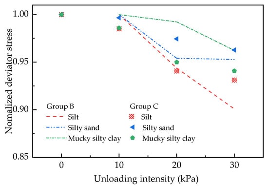 The final deviator stress at 15% axial strain is summarized in Table 4. The normalized deviator stress–unloading intensity curves for Group B and C tests are shown in Figure 6, where Group B used B−1 as a reference value and Group C used the conventional triaxial A−0 as a reference value. Increased unloading intensity had the greatest effect on the deviator stress of silt. When unloading intensity was set at 30 kPa, the deviator stress of silt was reduced by 10% under the unloading path, and by 7% under the unloading reloading path. The variation law of the deviator stress of the three soils with unloading intensity is consistent under the unloading–reloading path. When unloading intensity was low, deviator stress reduction was not readily apparent. With increasing unloading intensity, the deviator stress rapidly decreased at first and then slowed down. In practical engineering, although the stress level of the soil is restored following foundation pit excavation and structural construction, close attention should be paid to the effect of the unloading–reloading stress path on the shear strength of the soil.