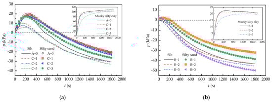 Pore pressure development of different soils under different stress paths. (a) Groups A and C; (b) Group B.