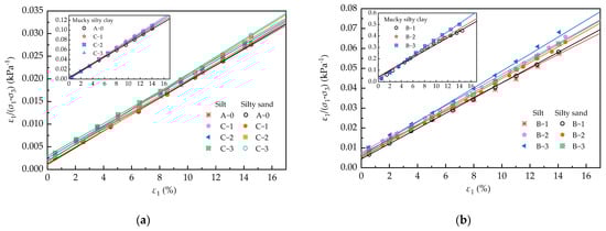 As shown in Equation (4), there was a linear relationship between ε1/(σ1 − σ3)and ε1. The intercept and slope of the line are a and b, respectively. The physical meaning of 1/a and 1/b is the ultimate strength of soil and the initial modulus.