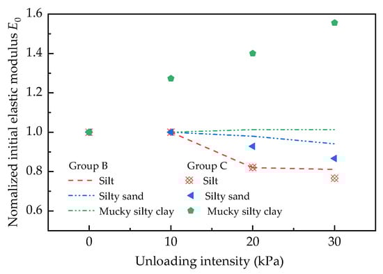 Figure 8 shows the normalized stress-strain relationship. R-squared values rangedfrom 0.9908 to 0.9998, which proves that the hyperbolic model is suitable for the normalization of the test results. Table 6 summarizes normalized curve parameters a and b, and initial modulus E0 under different stress paths. The a and b values of the three soils were greater in the unloading path, indicating that the ultimate deviator stress and initial elastic modulus were less than those under the two other paths. In the unloading–reloading path, when unloading intensity was 10 kPa, the a and b parameters were nearly identical to those of the conventional triaxial test for silt and silty sand. The a and b values of silt and silty sand increased as unloading intensity increased, indicating that the ultimate deviator stress and initial modulus decreased. The relationship between normalized initial modulus and unloading intensity in different paths is shown in Figure 9, where Group B tests used B−1 data as a reference, and Group A and C tests used A−0 data as a reference. Unloading intensity had a greater effect on the initial modulus of silt in the unloading path. When unloading intensity increased to 30 kPa, the initial modulus of Groups B and C decreased by 19% and 23%, respectively. In the unloading–reloading path, the initial elastic modulus of mucky silty clay increased by 56% with the increase in unloading intensity.