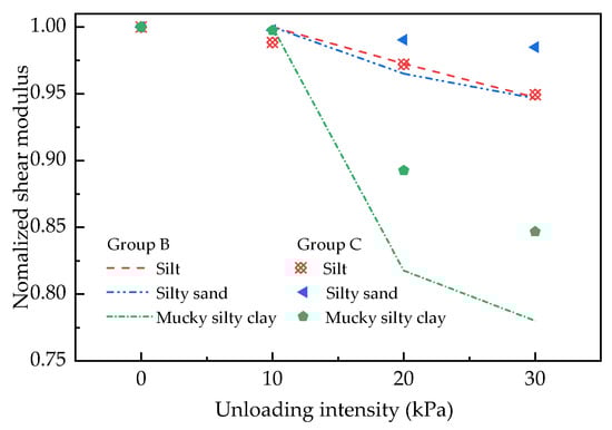 Figure 10 illustrates the relationship between normalized small-strain shear modulus and unloading intensity for various stress paths. Unloading intensity had the greatest effect on the small strain shear modulus of mucky silty clay. When unloading intensity increased to 30 kPa, the small-strain shear modulus of Groups B and C decreased by 22% and 15%, respectively, indicating that the apparent structural damage of mucky silty clay was caused by unloading disturbance. In the unloading path, the small-strain shear moduli of silt and silty sand were similarly influenced by unloading intensity and were reduced by less than 5%. In the unloading–reloading path, the small-strain shear stiffness of the three soils remained essentially unchanged compared to the conventional triaxial path, but it significantly decreased as unloading intensity increased.