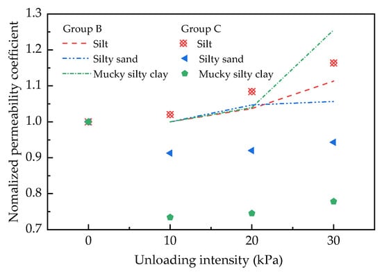 Table 8 summarizes the permeability coefficients of soil samples in the three different stress paths. The three soils had permeability coefficients ranging from large to small: silty sand, silt, and mucky silty clay. In the unloading path, silt and silty sand have higher permeability coefficients than that of the conventional path, whereas the permeability coefficient of mucky silty clay was lower than that of the conventional path, and gradually increased with increasing unloading intensity. In the unloading–reloading path, silt had a higher permeability coefficient than that of the conventional path, while silty sand and mucky silty clay had a lower permeability coefficient than that of the conventional path. The variation curve of the normalized permeability coefficient with unloading intensity for three soils is shown in Figure 11. The permeability coefficient increased as unloading intensity increased. Unloading strength had the greatest effect on the permeability of mucky silty clay, but the overall permeability coefficient was small. In comparison to silty sand, the permeability of silt was more dependent on unloading intensity. The permeability coefficient increased by 11% and 16% in the unloading and unloading–reloading paths, respectively.