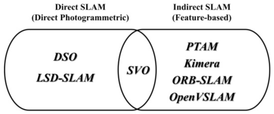 SLAM systems can be divided into direct SLAM, which uses every pixel of the camera frame, and indirect SLAM, which uses a series of key frames and feature points. Direct SLAM has a slow processing speed, but it is possible to model the surrounding environment closely and has excellent performance, even in a featureless environment. On the other hand, indirect SLAM a has fast processing speed because it estimates the camera location using certain pixels in the image and creates a 3D map [10].