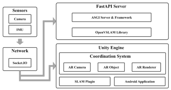 The mobile AR system proposed in this paper consists of sensors, networks, a Unity engine, and a FastAPI server. The image and IMU data collected by the camera of the mobile device are serialized through ProtoBuffer and transmitted to the SLAM system through Socket.IO. At this time, the SLAM system can be a SLAM system or a FastAPI server built into the Unity Android app in the form of a plugin. In the former case, SLAM is performed in the mobile device app, whereas in the latter case, SLAM can be performed through the multi-process environment considering multiple clients.