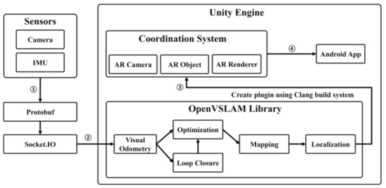 The existing OpenVSLAM uses Pangolin to visualize SLAM’s keyframes, camera poses, and point clouds based on a pre-prepared dataset to show how SLAM works. Pangolin is a lightweight and fast 3D visualization library for managing OpenGL displays and abstracting image input that is widely used in computer vision as a means to remove platform-specific boilerplate and easily visualize data [30]. In this paper, to design a SLAM system targeting the Android platform, the Unity engine was used instead of Pangolin, and the Unity API was used to control the camera and render the AR contents. The Unity engine is an authoring tool that provides a development environment for 3D and 2D video games and an integrated development tool for creating interactive contents, such as 3D animation, architectural visualization, virtual reality, and AR. It supports various platforms, such as Windows, MacOS, iOS, and Android.