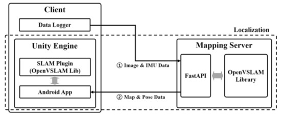 Figure 7 is the overall workflow of the OpenVSLAM-based mobile AR system. Images and IMU data are collected by the user’s client’s mobile device camera and transmitted to the Python FastAPI server for mapping. On the mapping server, map data and camera pose data are obtained through the OpenVSLAM and transmitted to the Android application of the user client’s Unity engine to visualize the global map and location.