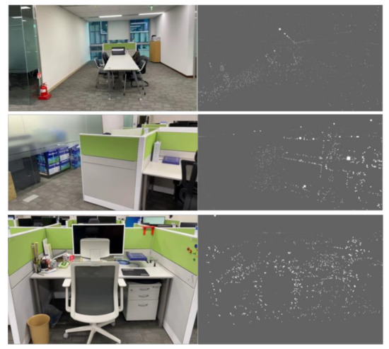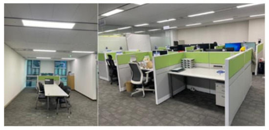 Figure 8 shows the indoor (office) experimental environment used for the experiment. The indoor space has an area of about 65 m2, and it was captured using the camera of the Galaxy Note 20 Ultra 5G.