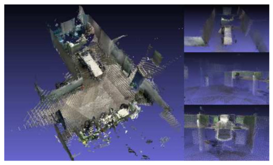 To verify this, the RTAB-Map application was installed on an iPhone 12 Pro with a LiDAR sensor, and the indoor environment shown in Figure 11. The RTAB-Map application for iOS was released in June 2021 and is an RGB-D based on loop closure detection, stereo, and a LiDAR graph-based ROS SLAM system. Loop closure detection uses the BoWs approach to determine the likelihood that a new image comes from a previous or new location. In addition, when loop closure is detected, it detects the previous location and draws a map, enabling real-time mapping for a large-scale environment [32]. Since the RTAB-Map SLAM system can draw a more accurate map through a depth sensor, it is estimated that adding depth data to the system in this paper will enable a clearer and more accurate AR system to be implemented in a mobile environment. Therefore, in this paper, further research and development will be conducted using the iPhone’s LiDAR sensor by changing the existing Android-based data collector to an iOS-based data collector.
