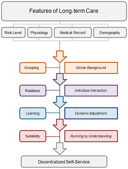 According to the proposed mapping mutual clustering method and its implementation with the mutual algorithm as a description of the implementation of the mapping mutual clustering algorithm above, in order to build a long-term and comprehensive guideline for further system applications, it is necessary to build a framework called the decentralized self-service framework as Figure 1 depicted. The basic idea of the decentralized self-service framework is that the features are identified clearly with four factors including rick level, physiology, medical records, and demography, the steps are illustrated obviously from grouping to suitability, and the service is grouped into a kind of self-service, which can open to social networks. Based on extant approaches and their limitations, the proposed mutual algorithm not only integrates different data from diverse features but also considers utilizing a classification algorithm in Artificial Intelligence to dynamically increase accuracy. Therefore, adding a self-service mechanism is an important step before building the proposed the decentralized architecture of long-term care. The self-service framework is a grouping based on their similar backgrounds, finding relations of individual interaction; and learning by dynamic adjustment, and running suitably and successfully through mutual understanding.