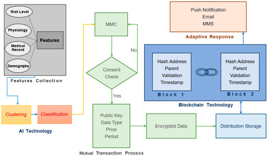 Existing studies present a personal information management, which can offer specific features such as interests or contact lists related to the characteristics of older people, to manage communication through a centralized cloud system [13,14,15,16]. The basic idea behind the decentralized architecture of long-term care to replace or support human resource agencies or other specific local platforms as controlled centers is that good services can consider all human resources to adjust to or coordinate their needs [17]. Existing studies still try to offer cloud services to achieve sharing medical data with entities with minimal data privacy [18]. Although existing studies suggest using smart contracts to track the behavior of violations of data permissions, the current studies have some serious problems since it does not consider other impacts for older people such as risk levels. In addition, one of the common limitations of those approaches is that many older people long for a social network in order to have regular interaction with one another to manage spiritual loneliness, and they lack a platform for mutual algorithm and adjusted abilities based on a mapping process suitable for older people [19]. To the second research question, one of the major challenges is to face in this field is to explore a process innovation [20] in search of this answer. In order to solve the second research question and the problems mentioned above, this study proposes the use of the decentralized architecture of long-term care to store a mapping or transaction procedure based on AI methods, and the information would be secured and shared across all network candidates.