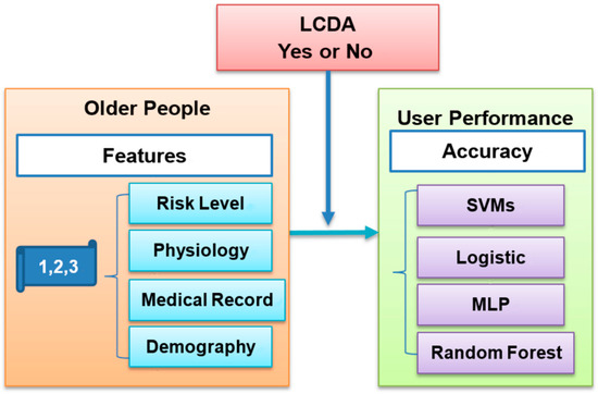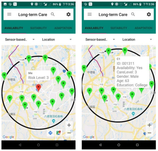 Twelve participants were randomly recruited from various locations (e.g., nursing home, hospital, park) to fill out a questionnaire in order to collect features data (https://drive.google.com/file/d/1rvx-T9krnsZ-ErRgl-wESieP2qFnBfos/view?usp=sharing, accessed on 1 January 2022) of LCDA. To help participants understand LCDA, the prototype system (Figure 4) has been developed with mobile application software to assist them in completing the questionnaire successfully.