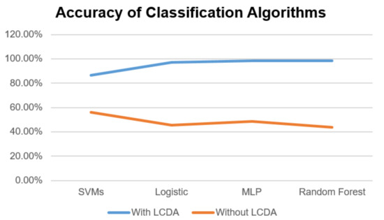 The accuracies are 86.36%, 96.97%, 98.48%, and 98.48% using SVMs, logistic, and MLP, random forest, respectively. The MLP and random forests achieve the highest level of accuracy (Figure 6).
