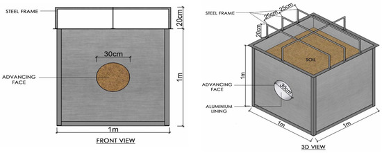In the present study, a cubical tunnel box of 1 m dimensions was manufactured with a galvanized iron sheet of 14-gauge thickness. An opening of 30 cm diameter on the vertical walls was provided to insert the lining. A steel frame was attached to the tunnel box for levelling and measurement purposes. The schematic diagram of the laboratory model is shown in Figure 3. Tunnel lining was simulated through an aluminium sheet with 26-gauge thickness.