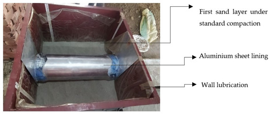 The lining was filled with soil before the final installation to avoid initial deformation and to simulate the actual ground conditions before excavation. Boundaries of tunnel boxes were lubricated using oil to simulate the frictionless boundary. The sand was then filled in the tunnel box with normal compaction using a standard rammer. Sand was filled in three layers of equal compaction and width. Figure 5 shows the placement of lining inside the tunnel box.