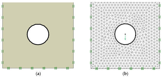 A 2D finite-element model was generated on Optum G2 having plan dimensions 1 m × 1 m with a circular opening of 30 cm diameter at the center of tunnel box. The main objective of this analysis was to validate our numerical modeling using experimental observations. Tunneling simulation was done through the convergence-confinement method (CCM). CCM has been widely used by various researchers for simulating tunneling problems [46,47,48,49]. CCM is based on the concept of the convergence of the ground, the support pressures, and the resulting confinement losses [46]. The generated numerical model is shown in Figure 7a and the discretized mesh model shown in Figure 7b.