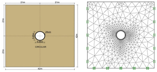 For the lab model, the soil was modelled using properties given in Table 1. The lining was modelled with concrete properties [54] given in Table 2 using the plate element. Square yield criteria were used for the plate element and the material was considered impermeable. Meshing and boundary conditions were applied as discussed in Section 3.1, and Figure 8 shows a meshed model for tunnel model with a circular opening.