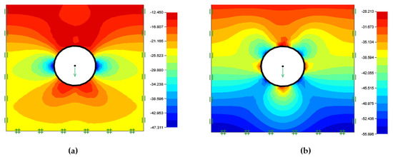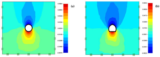 Vertical displacement contours for (a) soil mass and (b) aluminium lining.