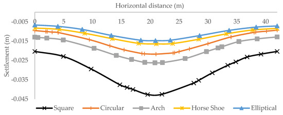 - Numerical analysis showed the least maximum settlement for an elliptical-shaped liner with a magnitude of 1.4 cm. However, the highest maximum settlement of 4.2 cm was recorded for square-shaped linings. The descending order of maximum settlement was elliptical–horseshoe–circular–arch–square.