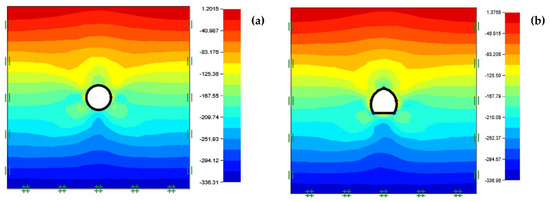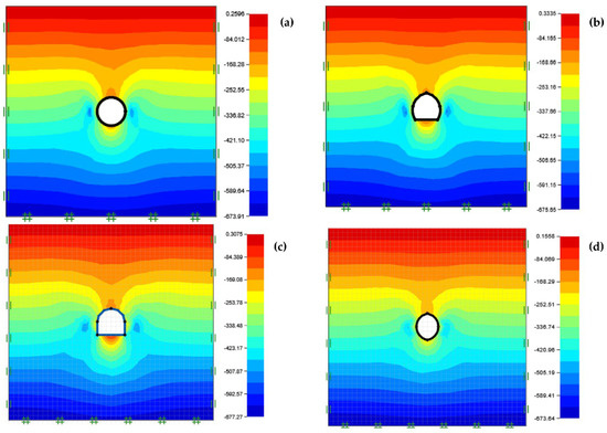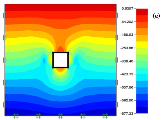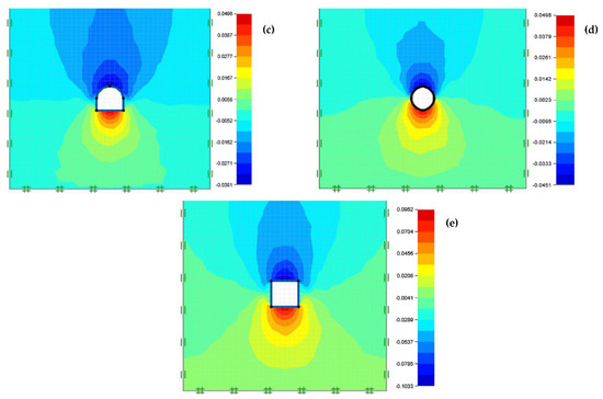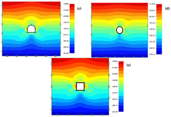 Principal stresses (σyy) in soil having (a) circular-, (b) arch-, (c) horseshoe-, (d) elliptical-, and (e) square-shaped openings.