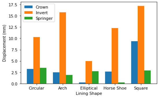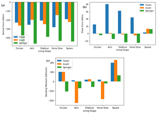 Displacement of tunnel concrete linings can significantly affect the stability of the tunnel. Displacement of even a small magnitude can make the structure unfit for operation. In the same way as for soil movement, the tunnel also experiences horizontal and vertical displacements. However horizontal displacement can be countered by an intact soil mass and has a negligible effect on the structural integrity of the tunnel lining. Vertical displacement, on the other hand, causes significant damage to the lining in terms of visible cracks, spalling, and, in severe cases, collapse of the lining due to an increase in stresses and strains beyond permissible limits. Results suggested that elliptical-shaped lining are most stable with a maximum displacement of 5 mm. Maximum displacement occurred at an invert location for all shapes. Figure 16 shows the plotted vertical displacement contours for different geometric shapes. The least stable was the square-shaped lining with a maximum displacement of 17 mm. There was a constant displacement along with the springer locations in the horseshoe- and square-shaped linings due to vertical plate boundaries whereas for other shapes there was a variation along the vertical lining due to arching effect. The stability of an elliptical shape can be understood through the concept of arches and the distribution of forces in them. Maximum displacements were observed at three crucial points on tunnel lining—crown, springer, and invert. On the horizontal axis, different shapes of lining are presented. The effect of different shapes of tunnel linings has been analyzed and the normal force, shear force, and bending moment has been reported. Figure 17 shows variations in (a) normal force, (b) shear force, and (c) bending moment for crucial tunnel points i.e., crown, springer, and invert. The horizontal axis represented the lining shape.