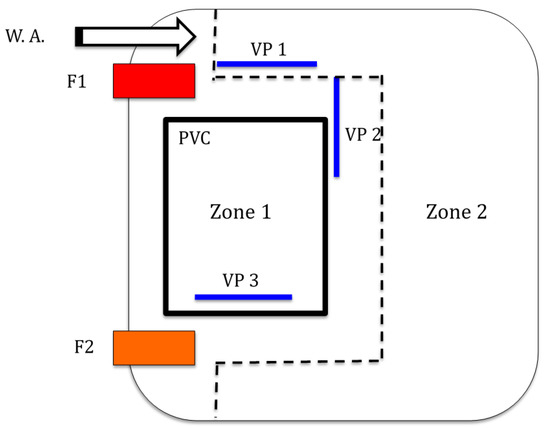Top view of the tank with physical enrichment and showing parts of the tank that differ by the luminosity (zone 1–5 Lux vs. zone 2–20 Lux) due to the cover with PVC plank (PVC). The zones are delimited by the dash line. The surface of zone 1 was larger than the surface of the planks because it projects shadow on the bottom of the tank. W.A. = water arrival; F1, F2 = automatic feeders; VP1, VP2, VP3 = vertical pipes.