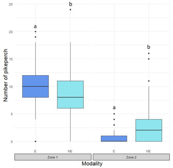 Median (quartiles) of pikeperch numbers in the different zones (1 and 2). Two different letters mean a significant difference (p < 0.05). E: enrichment, NE: no enrichment.