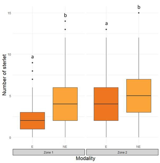 Median (quartiles) of sterlet numbers in the zones (1 and 2). Two different letters mean a significant difference (p < 0.05). E: enrichment, NE: no enrichment.