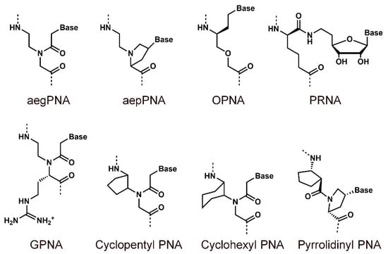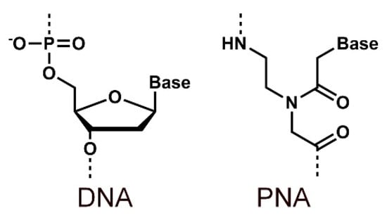 - Das, A.; Pradhan, B. Evolution of peptide nucleic acid with modifications of its backbone and application in biotechnology. Chem. Biol. Drug Des. 2021, 97, 865–892. [Google Scholar] [CrossRef]
