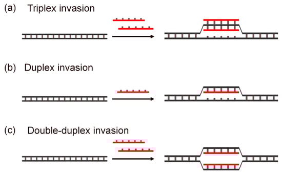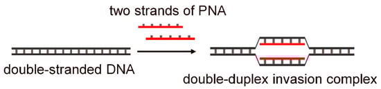 - Lohse, J.; Dahl, O.; Nielsen, P.E. Double duplex invasion by peptide nucleic acid: A general principle for sequence-specific targeting of double-stranded DNA. Proc. Natl. Acad. Sci. USA 1999, 96, 11804–11808. [Google Scholar] [CrossRef] [PubMed]
