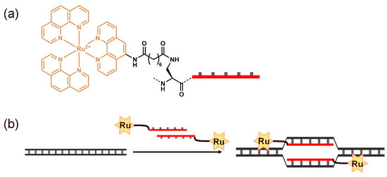 - Hibino, M.; Aiba, Y.; Watanabe, Y.; Shoji, O. Peptide Nucleic Acid Conjugated with Ruthenium-Complex Stabilizing Double-Duplex Invasion Complex Even under Physiological Conditions. ChemBioChem 2018, 19, 1601–1604. [Google Scholar] [CrossRef] [PubMed]