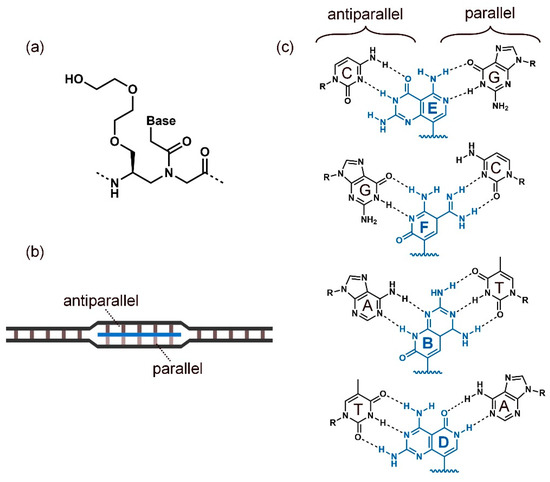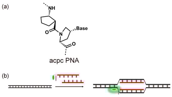 - Liang, X.; Liu, M.; Komiyama, M. Recognition of Target Site in Various Forms of DNA and RNA by Peptide Nucleic Acid (PNA): From Fundamentals to Practical Applications. Bull. Chem. Soc. Jpn. 2021, 94, 1737–1756. [Google Scholar] [CrossRef]