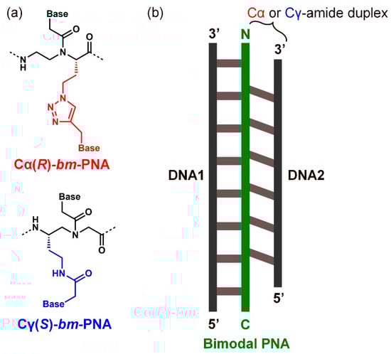 - Bhingardeve, P.; Madhanagopal, B.R.; Ganesh, K.N. Cγ(S/R)-Bimodal Peptide Nucleic Acids (Cγ-bm-PNA) Form Coupled Double Duplexes by Synchronous Binding to Two Complementary DNA Strands. J. Org. Chem. 2020, 85, 13680–13693. [Google Scholar] [CrossRef] [PubMed]