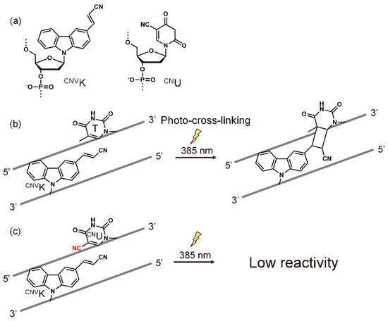 - Fujimoto, K.; Yamada, A.; Yoshimura, Y.; Tsukaguchi, T.; Sakamoto, T. Details of the Ultrafast DNA Photo-Cross-Linking Reaction of 3-Cyanovinylcarbazole Nucleoside: Cis–Trans Isomeric Effect and the Application for SNP-Based Genotyping. J. Am. Chem. Soc. 2013, 135, 16161–16167. [Google Scholar] [CrossRef]
