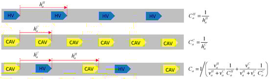 If only a single class (e.g., HV or CAV) is present, we can obtain Equation (3), and Equation (1) can be written as Equation (4) using Equation (3).
