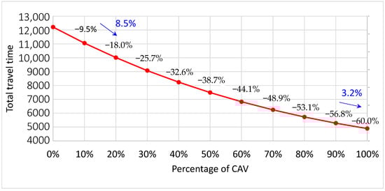 To begin, we assessed the network’s overall travel time as a result of multi-class TAP in Figure 5. As expected, when the percentage of CAVs increased, overall travel time decreased due to increased capacity. However, overall travel time was reduced nonlinearly, although the percentage of CAVs was raised linearly. Increases in the proportion of CAVs at an early stage (0 percent to 10% of CAVs) were more effective than increases at a later stage (90 percent to 100 percent of CAVs). Additionally, when the percentage of CAVs was 100%, capacity improved by 50%, as shown in Figure 2b, while overall travel time improved by 60%. As a result of the findings, we could infer that the network was highly congested when only HV demand was used.