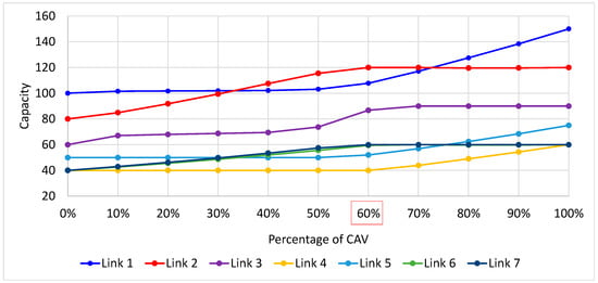 Second, by increasing the percentage of CAVs, the trajectories of the link capacity were explored and presented in Figure 6. When the percentage of CAVs was increased from 0% to 60%, the capacities of links 2, 3, 6, and 7 increased, while the capacities of the other links (i.e., links 1, 4, and 5) increased above 60% of CAVs. This result indicated that more CAVs were allocated to routes 3 and 6 until 60% of CAVs was reached, while CAV flows were increased in routes 1 and 4 after 60% of CAVs was reached. This was because the links in routes 3 and 6 were approaching their maximum capacity, and the excess CAV flows were diverted to other underutilized links to increase capacity and decrease travel time accordingly. As could be seen, capacity expansion also did not follow a linear trend.