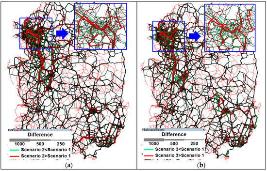 To illustrate the assigned flow difference and effect of travel time alleviation when CAVs drove on different roadway classes, Figure 9 illustrates the link flow differences between scenario 1 and other scenarios on a Geographic Information System (GIS) map. It should be noted that the scenarios were based on the specifications presented in Figure 7c. Links were categorized by thickness and color to emphasize the degree of the difference. The green color showed that the assigned flow in scenario 1 was higher than the assigned flows in other scenarios, and the red color indicated the reverse. The results in Figure 9 clearly show that the multi-class TAP considering mixed modes had a significant impact on flow allocations. The majority of the differences occurred on the freeway, where the freeway generally had a larger capacity; hence capacity was increased more when CAVs traveled more on the freeway compared to other roadways. Using vehicle kilometers traveled (VKT) and vehicle hours traveled (VHT) to evaluate the effect of allowing different rode classes for CAVs, VKT was not significantly affected by CAV driving (the values changed by 0.4%, 0.2%, and −0.5% in scenarios 2, 3, and 4, respectively, compared with scenario 1, whereas VHT was significantly decreased when CAVs drove on more roadways (the values changed by −2.3%, −4.1%, and −8.3% in scenarios 2, 3, and 4, respectively, compared with scenario 1). The reasons for the results were that more CAVs driving on the roadways could promote an increase in the overall network capacity, and this increased capacity influenced travel time reduction. Specially, when CAVs traveled more on the freeway, capacity on the freeway was increased compared to other roadways and travelers changed their route passing through the freeway to minimize their travel time, despite the travel distance increase. As a result, VKT was slightly increased in the comparison between scenario 1 and scenario 2 and between scenario 1 and scenario 3