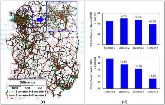 Flow difference between scenario 1 and other scenarios. (a) Scenario 1 and scenario 2; (b) scenario 1 and scenario 3; (c) scenario 1 and scenario 4; (d) VKT and VHT for scenarios.