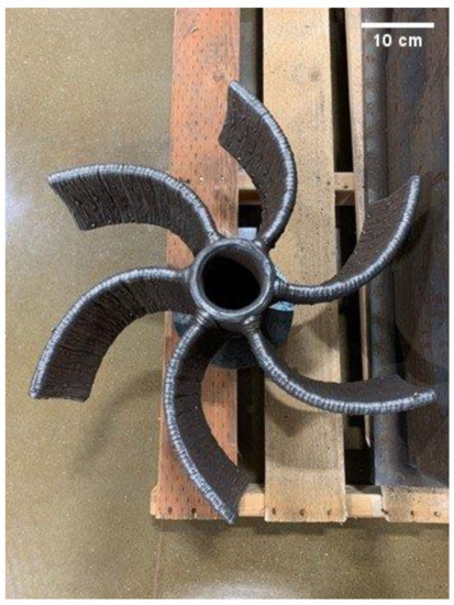Additive manufacturing (AM) is considered a revolutionary manufacturing technology in several industries, including medical, aerospace, transportation, energy, and consumer products. AM could be implemented for rapid prototyping, as well as for production through optimization and cost reduction of the design process [1]. The wire arc additive manufacturing (WAAM) process is a direct energy deposition technique used for printing large-scale three-dimensional objects, layer-by-layer. A wire feedstock is melted by leveraging a welding power source using a mechanical motion, often achieved via industrial robots [2]. The technology, also known as metal big area additive manufacturing (mBAAM) [3], offers a faster deposition rate and has the potential to revolutionize the way molds, pressure vessels, etc., are manufactured. It has been demonstrated that a complex shape, such as a propeller, can be fabricated using the WAAM process as shown in Figure 1. A technical report published in 2016 [4] suggested that 13–26 kg/h can be deposited using such technology.