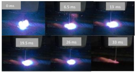 The droplet cycle (initiation to the detachment) for the binary and ternary blend is shown in Figure 2 and Figure 3. The droplet is not visible in the image due to the low intensity of the lighting used during the high-speed imaging; however, the droplet cycle can be observed as the metal transfer is typical to the surface tension transfer or short-circuit transfer. The period of each droplet cycle was 21.4 ms for the ternary blend and 33 ms on average for the binary blend.