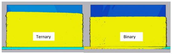 Height comparisons of the scanned wall structures are presented in Figure 5. Each scanned wall (Figure 5, yellow color) is compared with the original 132 × 250 × 13 mm computer-aided design (CAD) geometry (Figure 5 blue color). Although identical parameters were used, the binary blend underbuilt the height, while the ternary blend approached the height of the CAD model. This height difference is critical to the design phase of WAAM to achieve dimensionally accurate parts. There have been some technological advancements made that allow the deposition of additional layers in order to achieve dimensionally accurate parts with closed loop control [23]; however, in this study, we used open loop control to investigate the effect of using different shielding gases.