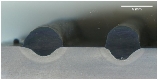 The total area of the deposition, including the dilution and bead, was 20.6 mm2 for the binary blend and 22.2 mm2 for the ternary blend. The dilution area below the surface was 5.7 mm2 for the binary blend and 6.6 mm2 for the ternary blend. The lower dilution area associated with the binary blend indicates that the total transferred heat was lower than that achieved with the ternary blend. It is obvious from the height difference in Figure 6 that the penetration and melting efficiency were higher with the ternary blend.