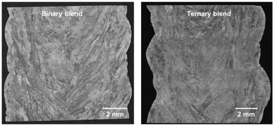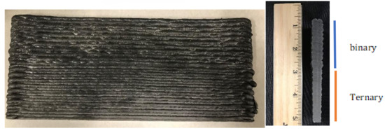 Cross-sections from both the binary- and ternary-blend walls were cut and mounted on a conductive mount. Figure 7 shows the thickness of the two walls. The thickness of each wall was measured at four different heights. The binary blend resulted in a significantly thicker wall (average thickness 12.5 ± 0.3 mm) than the ternary blend (average thickness 10.1 ± 0.1 mm). This difference is consistent with the previous observation of the penetration width from the bead-on-plate experiments (Figure 6).