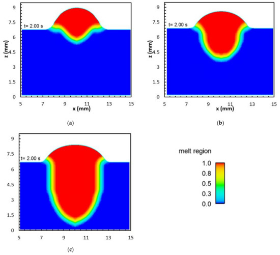 Melt region of the weld pool at 2 s for oxygen concentration, (a) 310 ppm, (b) 420 ppm, and (c) 500 ppm.