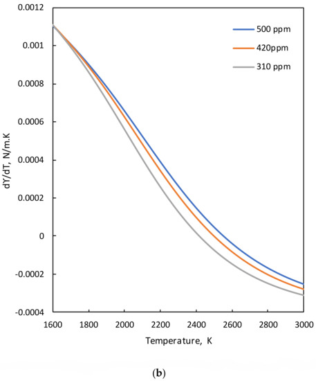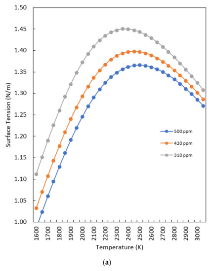 An identical heat flux value was used for these simulations, while different surface tension coefficient values were used. Oxygen concentrations of 310 ppm, 420 ppm, and 500 ppm were used to calculate the surface tension, according to Equations (1) and (2). Figure 10 shows the surface tension and surface tension coefficient with respect to the temperature for the three oxygen concentration values. The figure shows that as the temperature increased, the surface tension coefficient became negative (Figure 10). However, increasing the oxygen concentration increased the maximum temperature for which the surface tension coefficient remained positive from 2400 to ~2600 K.