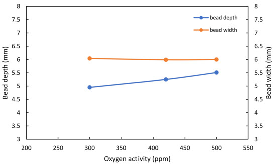 Figure 12 shows the simulation results of the melt pool depth and width; there is an increase in the depth of the weld pool by 10%, while the change in the width of the weld pool (in the crown) is insignificant. Zhao et al. obtained similar results using GTAW−P and oxygen as surface active elements [31]; however, their mathematical model [32] suggests that within the range of 280–500 ppm oxygen content, the penetration remains nearly constant.