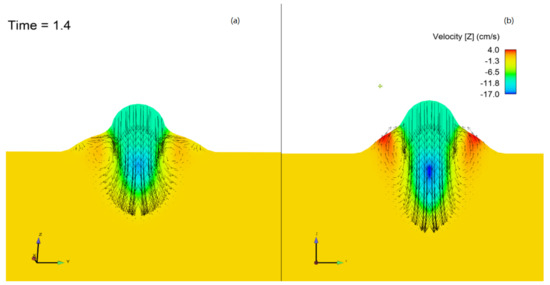Weld pool velocity distribution in the x-z plane for identical heat input for (a) 420 ppm oxygen concentration and (b) 500 ppm oxygen concentration. The velocity in the z-direction is indicated by the color, and the length and direction of the arrow.