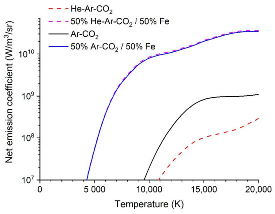 Figure 14. Net emission coefficient for the ternary and binary blends and for 50 mol% mixtures of each blend with metal vapor as a function of temperature [19,20,21].